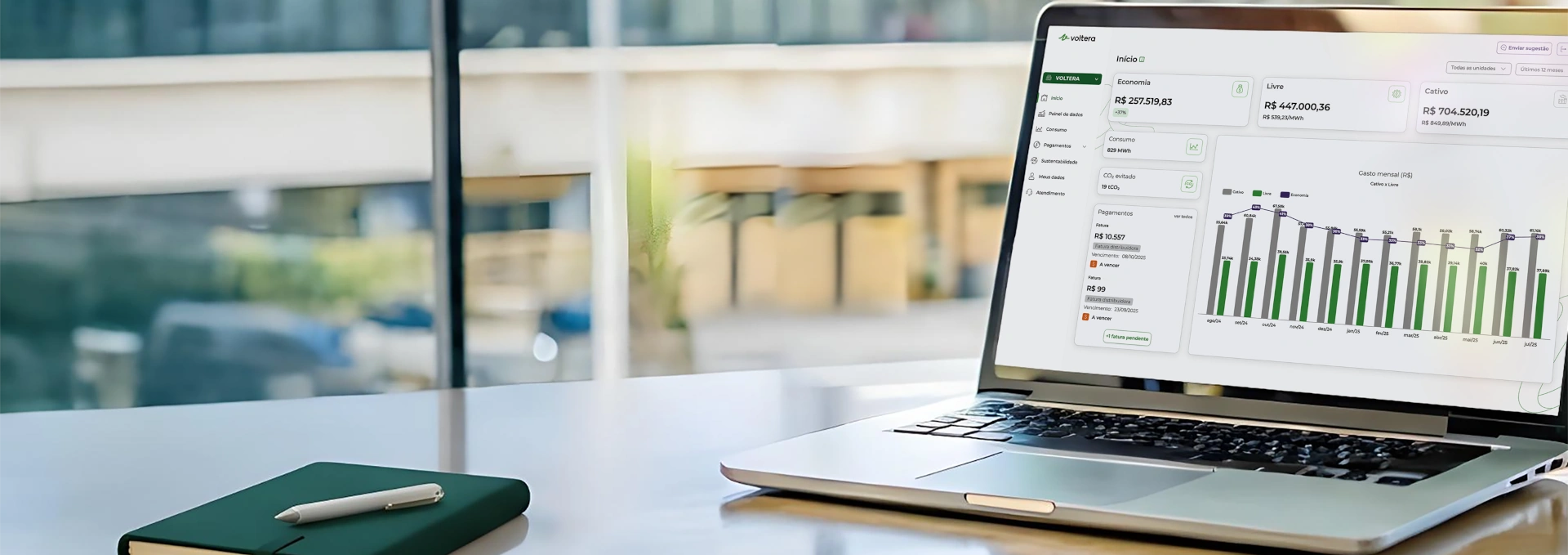 Além da portabilidade, oferecemos uma plataforma de gestão, onde você acessa suas faturas, acompanha o consumo e consulta sua economia de forma simples e prática.